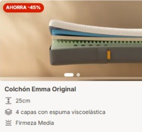 Emma ofrece envío gratis en 24-48 horas a toda España peninsular. El colchón llega comprimido en una caja compacta para facilitar el transporte. Solo tienes que desembalarlo, colocarlo en tu base y esperar 2-3 horas para que recupere su forma completa.